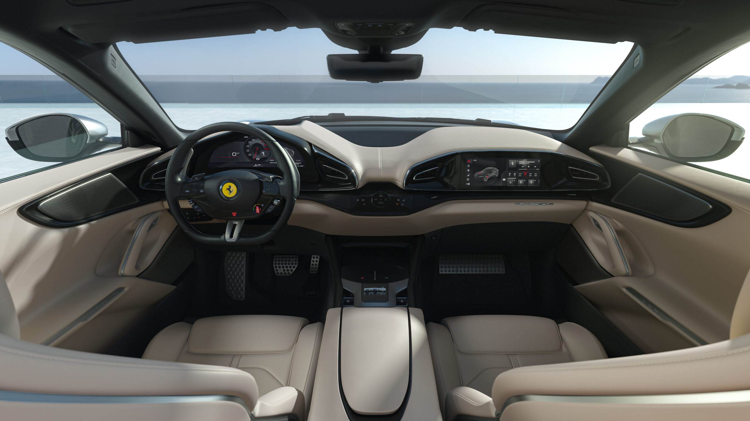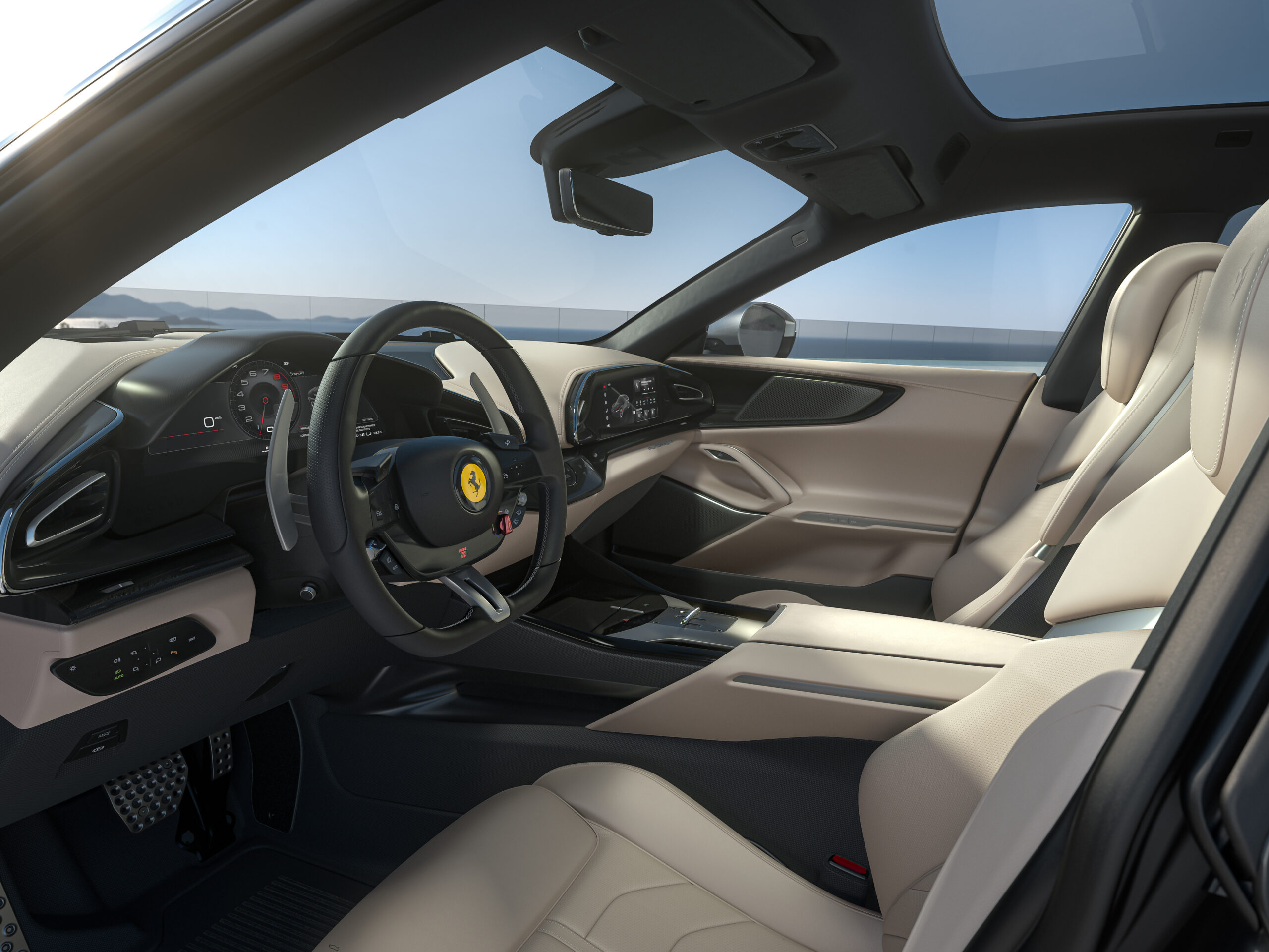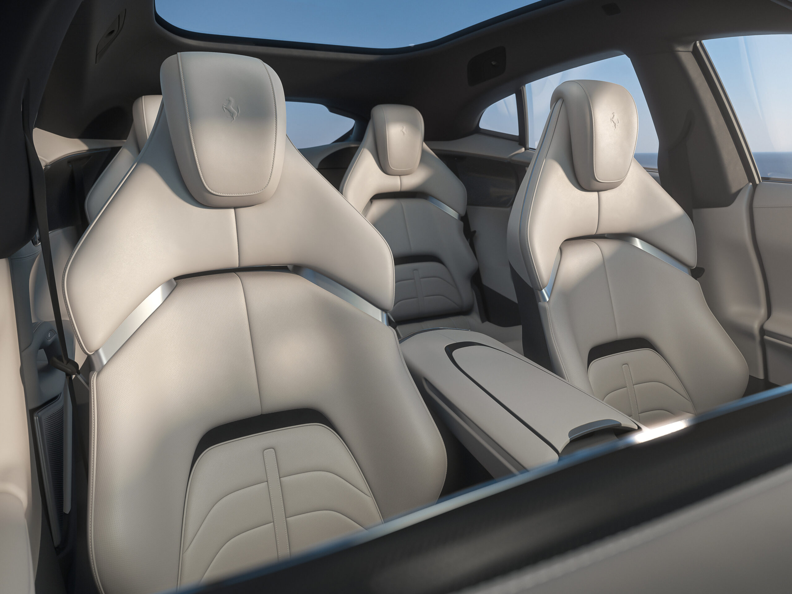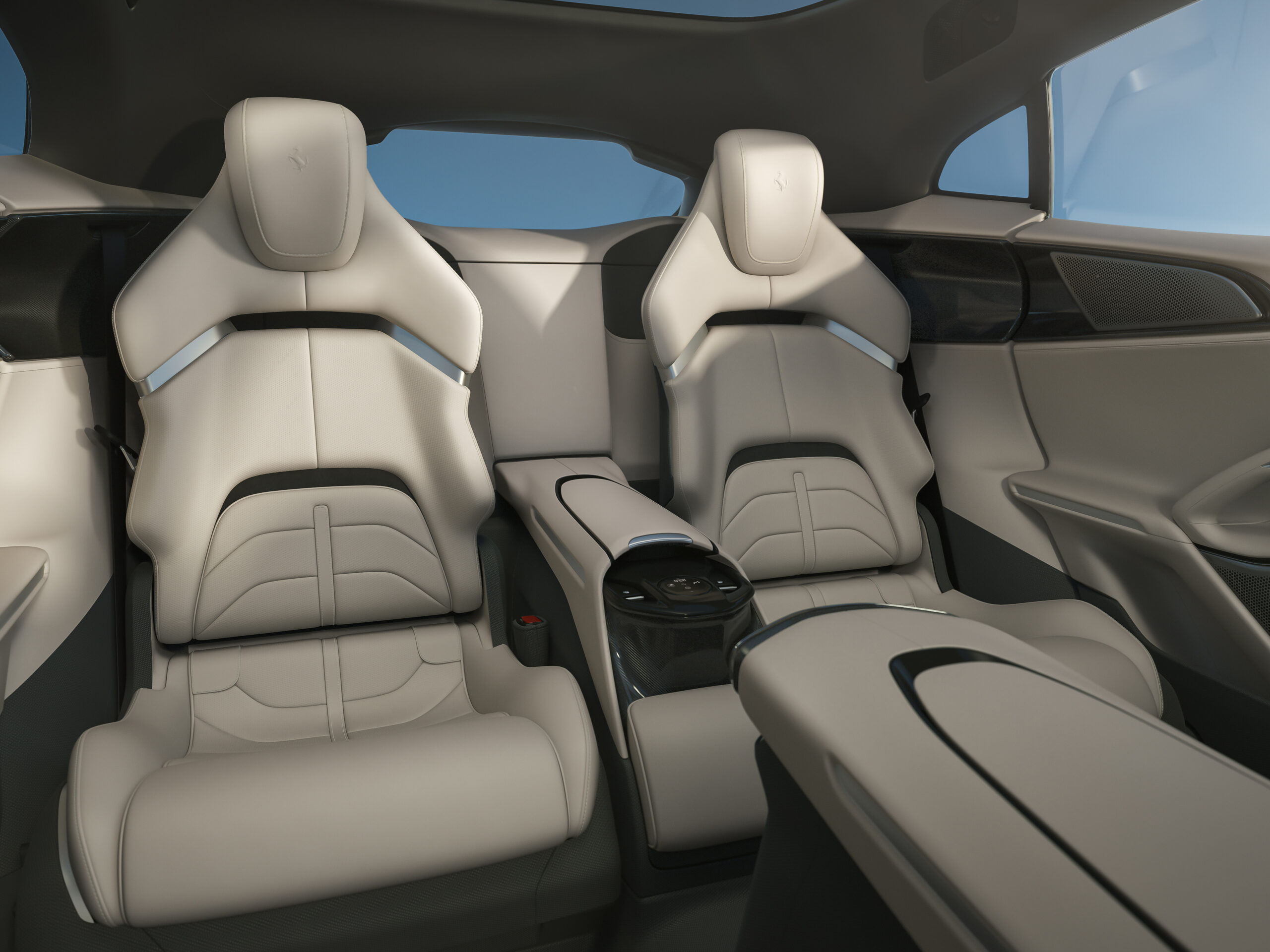The Ferrari Purosangue features the entirely digital interface already adopted for the rest of the range. The dual cockpit concept was extended and replicated in the back of the car, creating four areas quite distinct in terms of their functionality, volumes, materials and colours. For the first time in Ferrari history, the cabin has four separate and independently adjustable seats.